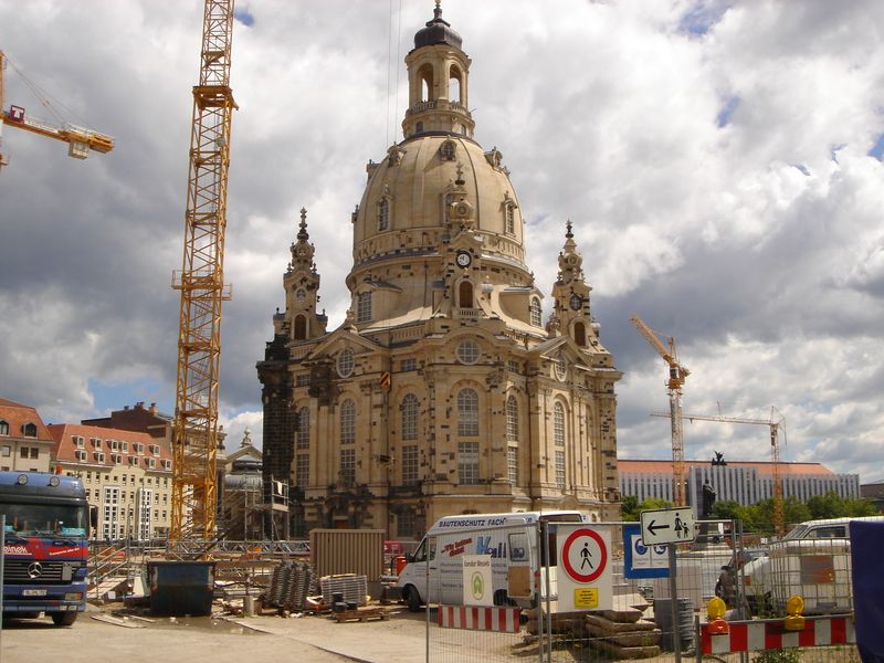 Frauenkirche umgeben von Baukränen |